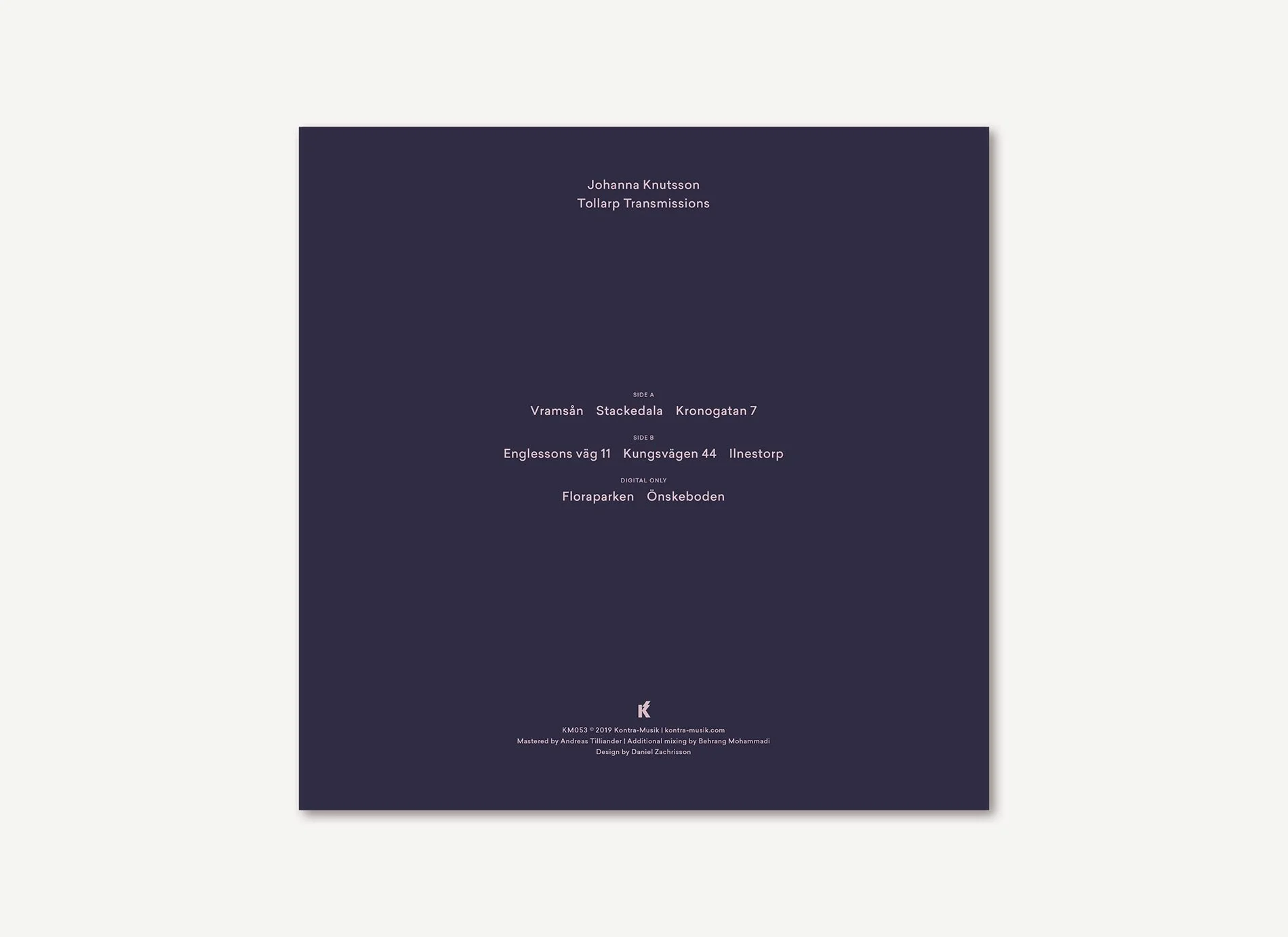 “Tollarp Transmissions is a deeply personal and moving album created by Johanna Knutsson. Closing herself off from the flutter of the outside world in her Berlin studio, Johanna has painted a series of melancholic yet warm pictures of her childhood for Kontra-Musik. Johanna grew up in the small hamlet of Tollarp in the south of Sweden, surrounded by fields, forests and silence - a priced commodity not to be found in Berlin. Each track is named after a physical memory of Tollarp, the intro Vramsån, for instance, is named after a stream close to Johanna’s home and heart. Befittingly, the first timbres of Vramsån remind one of Tuba Mirum from Mozart’s Requiem, solemnly played by an old ice cream truck. A sound every child in Sweden knows.